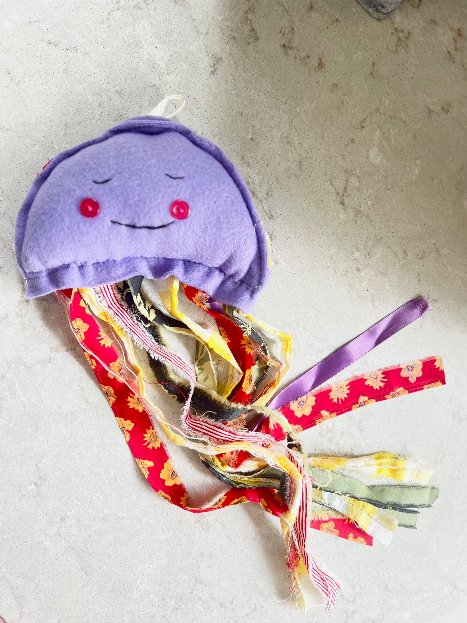 Hand sewn felt face with ribbon and fabric tentacles.